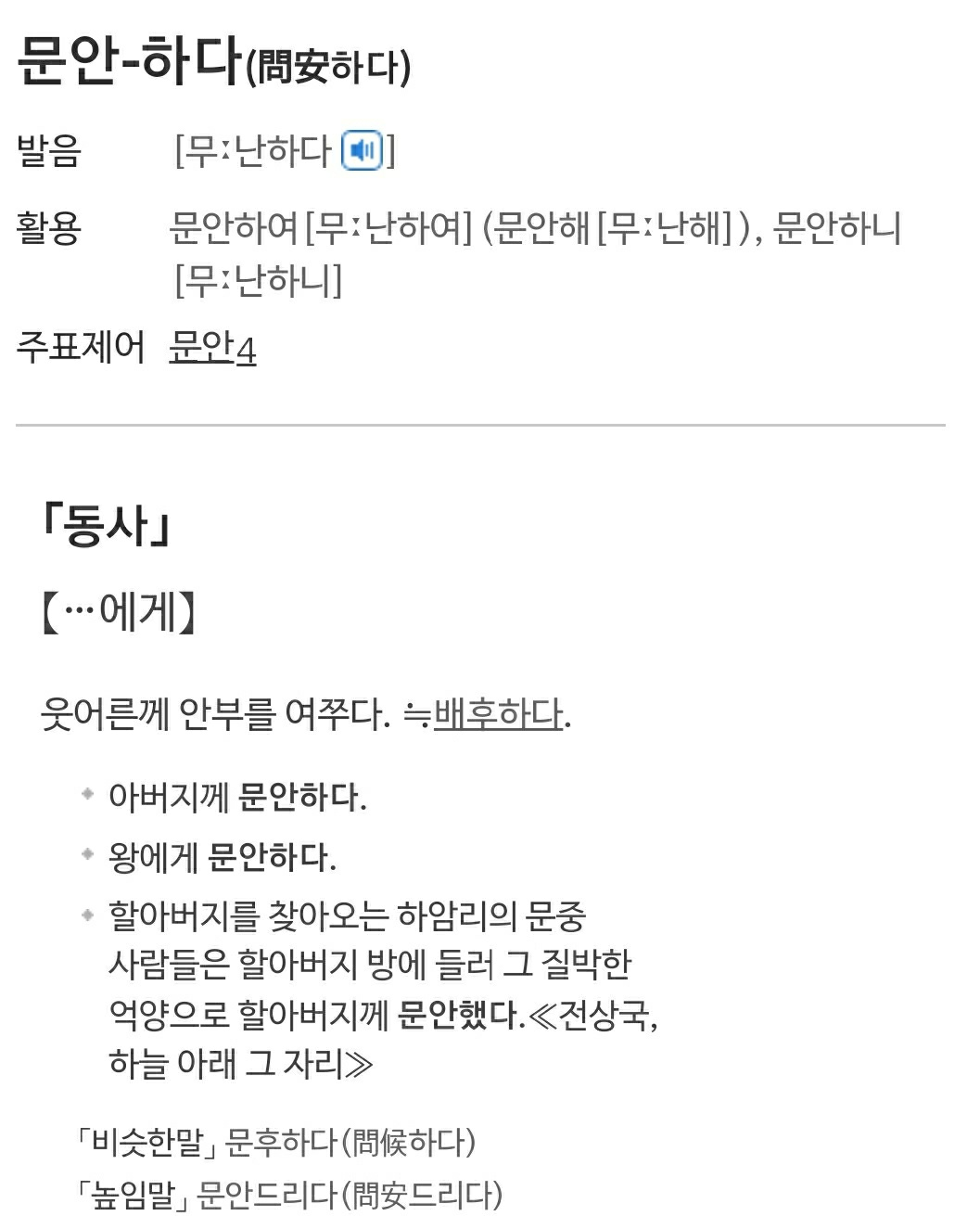 이번엔 '문안하다'의 뜻을 알아볼까요? 국립국어원 표준국어대사전의 정의는 다음과 같습니다.