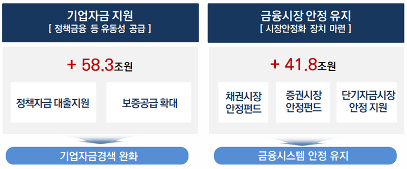 신문기사 제목으로는 대다수 '기업구호 긴급자금 100조원' 이라는 타이틀을 달고 있지만, 세부 정책 내용을 들여다 보면 '민생 · 금융안정 패키지 프로그램'이라는 큰 타이틀 하에 아래 그림과 같은 두개의 큰 축을 가진 정책이라는 것을 알 수 있었습니다.