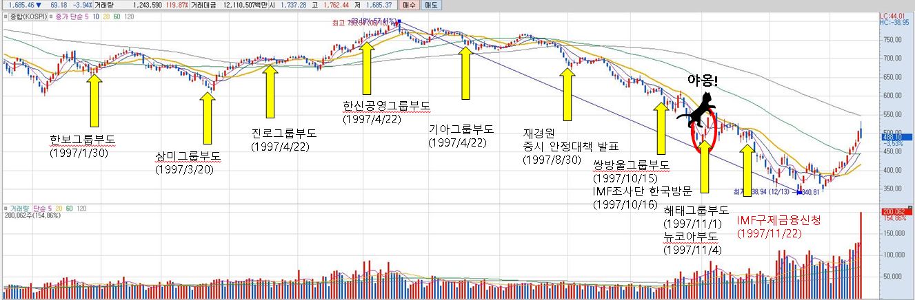 1997년 한 해 동안 많은 그룹사가 부도 처리됐다는 것을 알게 되었습니다. 그리고 IMF 구제금융 신청 이후, 1998년과 1999년에 1997년보다 많은 회사들이 정부 주도하에 구조조정과 합병을 단행하였다는 것도 확인할 수 있었습니다. 데드 캣 바운스는 해태그룹과 뉴코아가 부도 처리되던 시점인 11월 초에 발생하였습니다.
