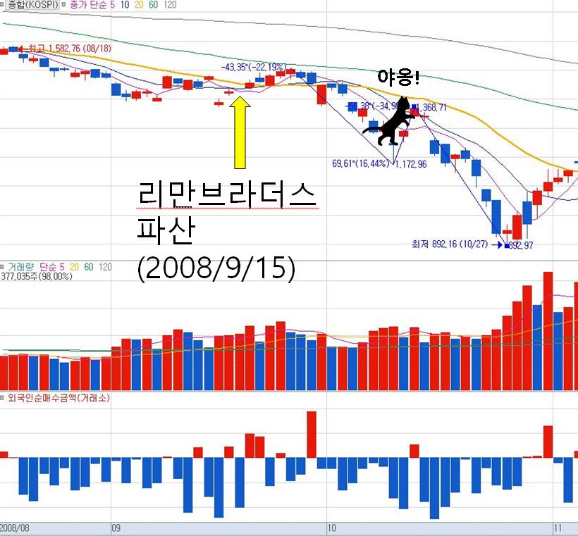 하지만, 데드 캣 바운스가 나온 뒤 9거래일 뒤인 2008년 10월 27일에 KOSPI는 최저점인 892.16을 기록하게 됩니다. 종가 기준 최저치(10월 26일 938.75pt)로 비교하면 8거래일만에 주가가 32% 하락한 셈이 되며, 데드 캣 바운스 이전 시작점(2008년 9월 25일) 기준으로는 38%가 하락하였습니다.