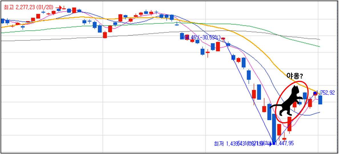 코로나19로 글로벌 경제가 침체에 들어서고 있는 요즘, 각국의 증시는 극심한 변동성을 보여주고 있습니다. 국내 증시는 2020년 3월 23일 KOSPI가 1,482.46 pt로 마감한 이래 단 1주일 만에 20%가 회복된 상황입니다. 물론 3월 23일 증시 최저점 이후, 3월 24일 금융위원회에서 100조 원 규모의 기업 구호 긴급자금 정책을 발표하였고, 3월 26일 한국은행에서 한국판 양적완화 대책도 발표하였기에, 현재 보이는 주가 상승이 경기 회복인지 유래 없는 정부 정책에 대한 선반영인지, 아니면 최근 화제 되고 있는 동학개미운동의 영향인지 보는 관점에 따라 다르게 해석될 여지가 있을 수 있는 부분으로 보입니다. 오늘은 [데드 캣 바운스(Dead cat bounce)]에 대해 알아보도록 하겠습니다.