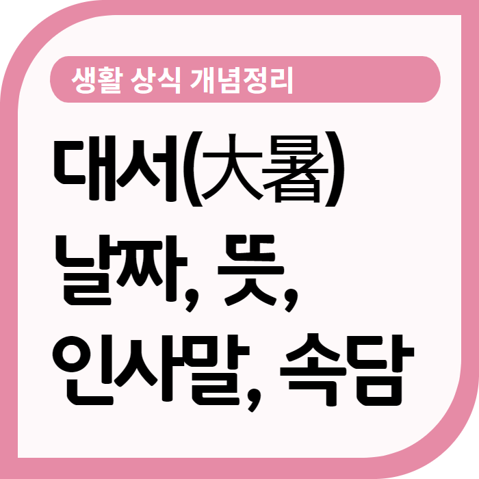 이제 정말 장마전선이 한반도에 영향을 강하게 끼치는 장마철이 왔습니다. 일본과 중국에 기록적인 피해를 남긴 아주 강력한 장마 전선이 서서히 우리나라로 올라오고 있는 것 같네요. 부산을 비롯하여 남부지방에는 며칠 전 하늘이 구멍난 듯한 폭우가 내려서 많은 피해가 있었다고 합니다. 장마가 끝나면 여름 중 가장 무더운 시기가 다가옵니다. 바로 중복(中伏)과 대서(大暑) 무렵이지요. 그중에서 정식 24절기에 해당하는 것은 대서(大暑)입니다. 24절기의 딱 중간, 열 두번째에 해당하는 절기 대서(大暑)는 일년 중 가장 더운 시기입니다. 그래서 '대서 더위에 염소 뿔도 녹는다'라는 속담까지 있었다고 하지요. 2023년 대서 날짜는 2023년 7월 23일 일요일입니다. 오늘 포스팅에서는 대서 날짜, 대서 뜻, 대서와 관련된 속담, 대서 인사말 등에 대해 자세히 소개해 드리도록 하겠습니다.