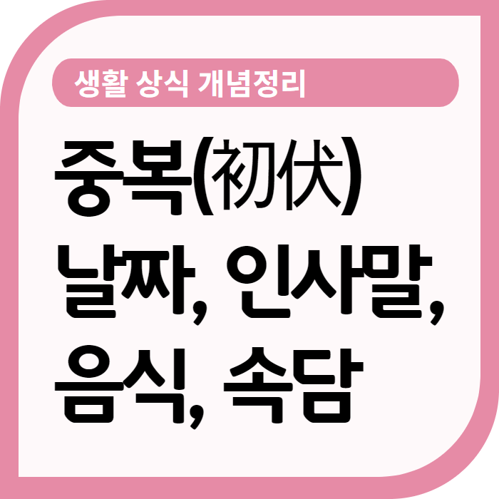 2024년 중복 날짜는 7월 25일 목요일 입니다. 중복(中伏)을 비롯한 삼복(三伏)을 24절기로 잘못 알고 있는 분들이 생각보다 많으시더라고요. 사실 삼복은 정식 24절기에 속하는 것이 아니라, 24절기를 기준으로 만든 속절 중 하나입니다. 삼복의 정확한 정의에 대해서는 제가 예전 포스팅에서도 한 차례 설명드린 적이 있지요?